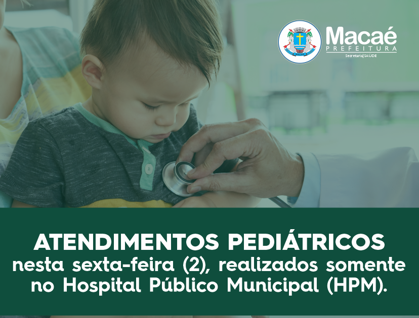 A Prefeitura de Macaé, por meio da Secretaria de Saúde, informa que os atendimentos de pediatria, nesta sexta-feira (2), serão realizados somente no Hospital Público Municipal (HPM).